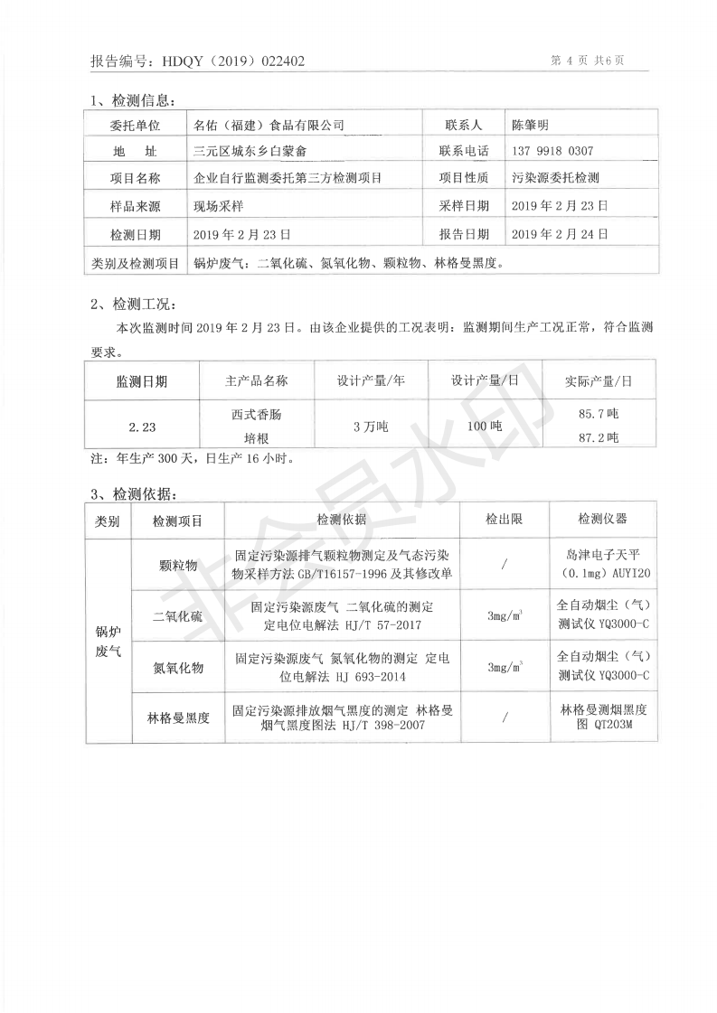 名佑(福建)食品有限公司2019年度2月環(huán)境自行監(jiān)測(cè)信息